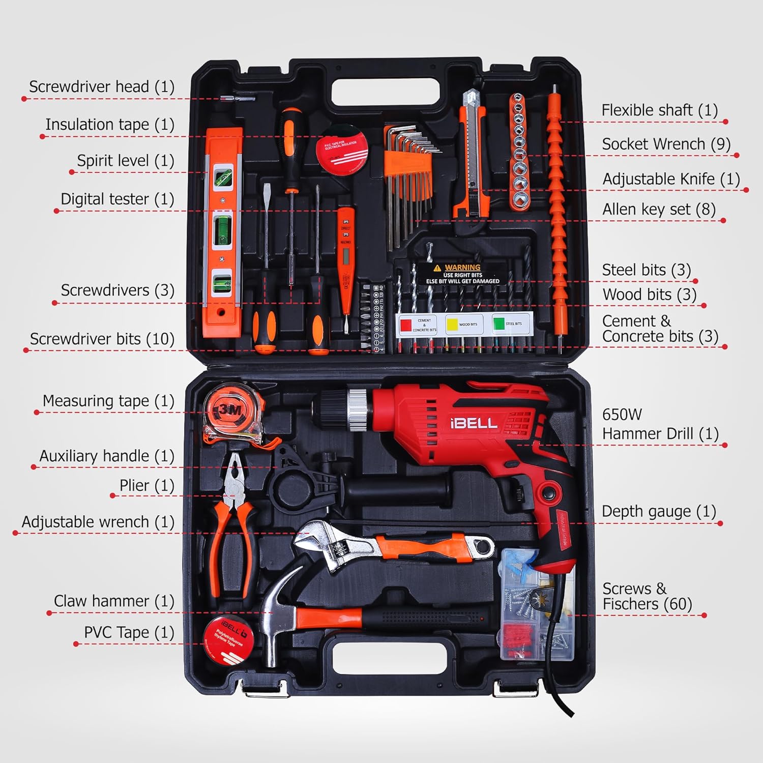 IBELL Professional Tool Kit with Impact Drill IBL TD13-100, 650W, Copper Armature, Chuck 13mm Keyless Auto, 115 Home Essential Tools/Accessories